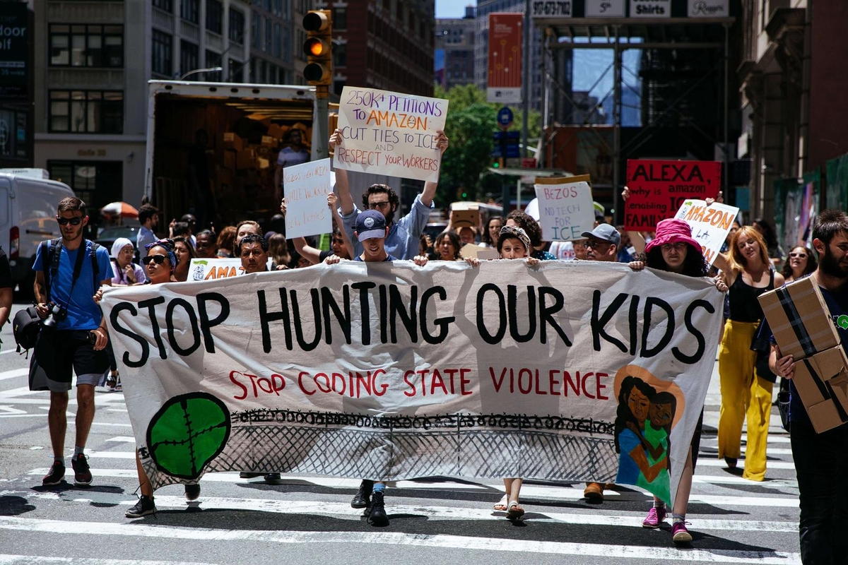 Tai įvyko per patį internetinių apsipirkimų įkarštį. „Amazon“ darbuotojai susirinko už objekto ribų, o jų plakatai skelbė: „Mes esame žmonės, o ne robotai“.