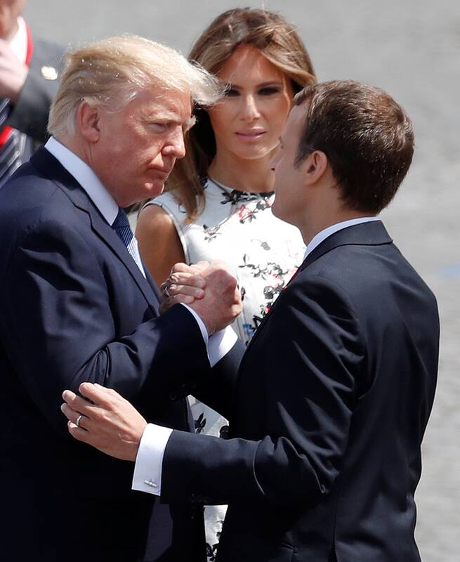 D. Trumpas ir E. Macronas paspaudė vienas kitam rankas, JAV prezidentui baigus stebėti karinį paradą, ir paskui dar kurį laiką jas spausdami ėjo alėja, kurioje vyko šis pompastiškas renginys. Tada D. Trumpas paplekšnojo Prancūzijos vadovui per petį ir jie susiėmė delnais lyg lenktų vienas kitam ranką.