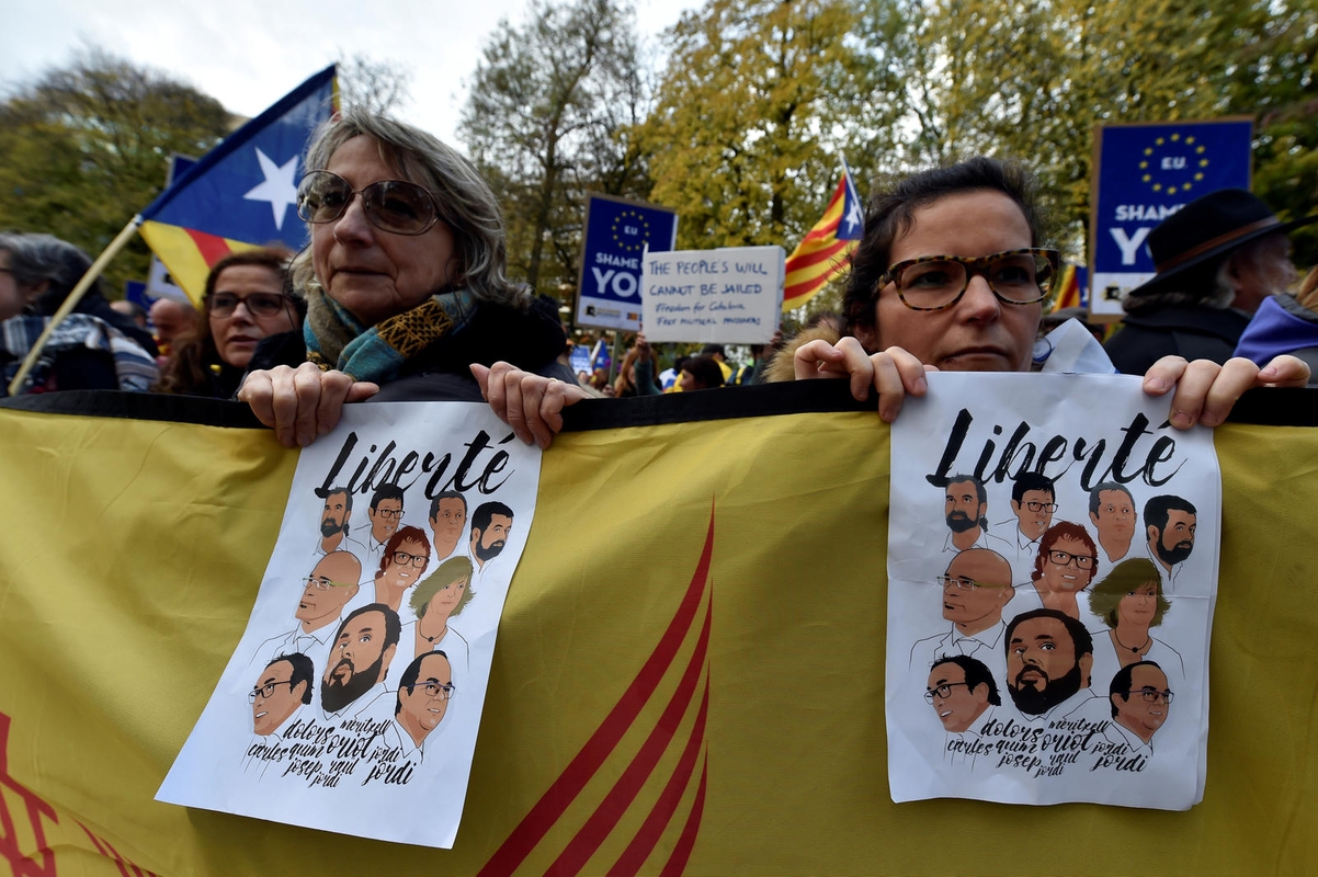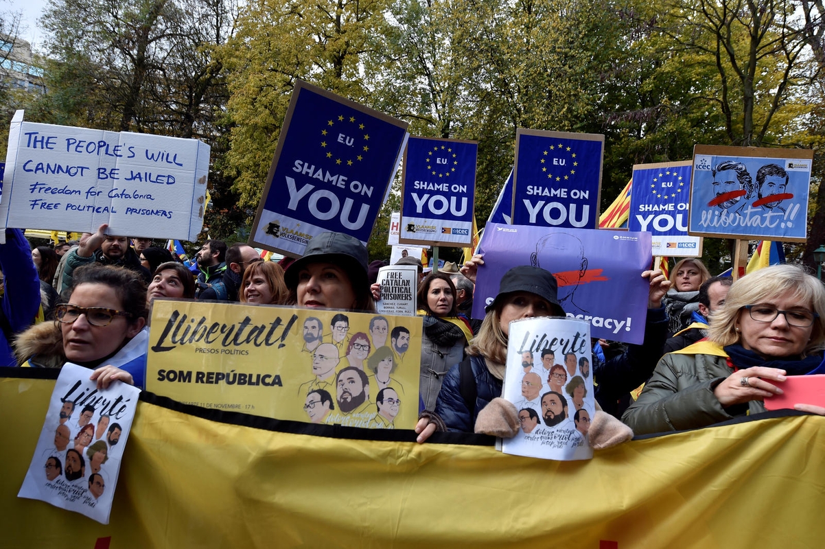 Protestas, kuris buvo surengtas keli metrai nuo pagrindinių Europos Sąjungos institucijų, įvyko kitą dieną po to, kai šimtai tūkstančių katalonų protestavo prieš regiono pareigūnų įkalinimą už jų siekį paskelbti Katalonijos nepriklausomybę.