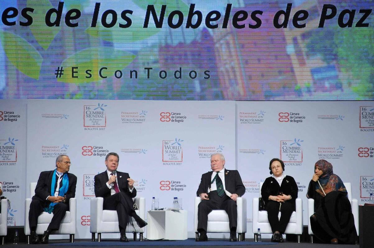 Nobelio taikos premijos laureatų keturių dienų susitikimą Bogotoje atidarė Kolumbijos prezidentas Juanas Manuelis Santosas (Chuanas Manuelis Santosas), pernai pelnęs šį prestižinį apdovanojimą už savo pastangas užbaigti pusę šimtmečio šalyje vykusį pilietinį karą.