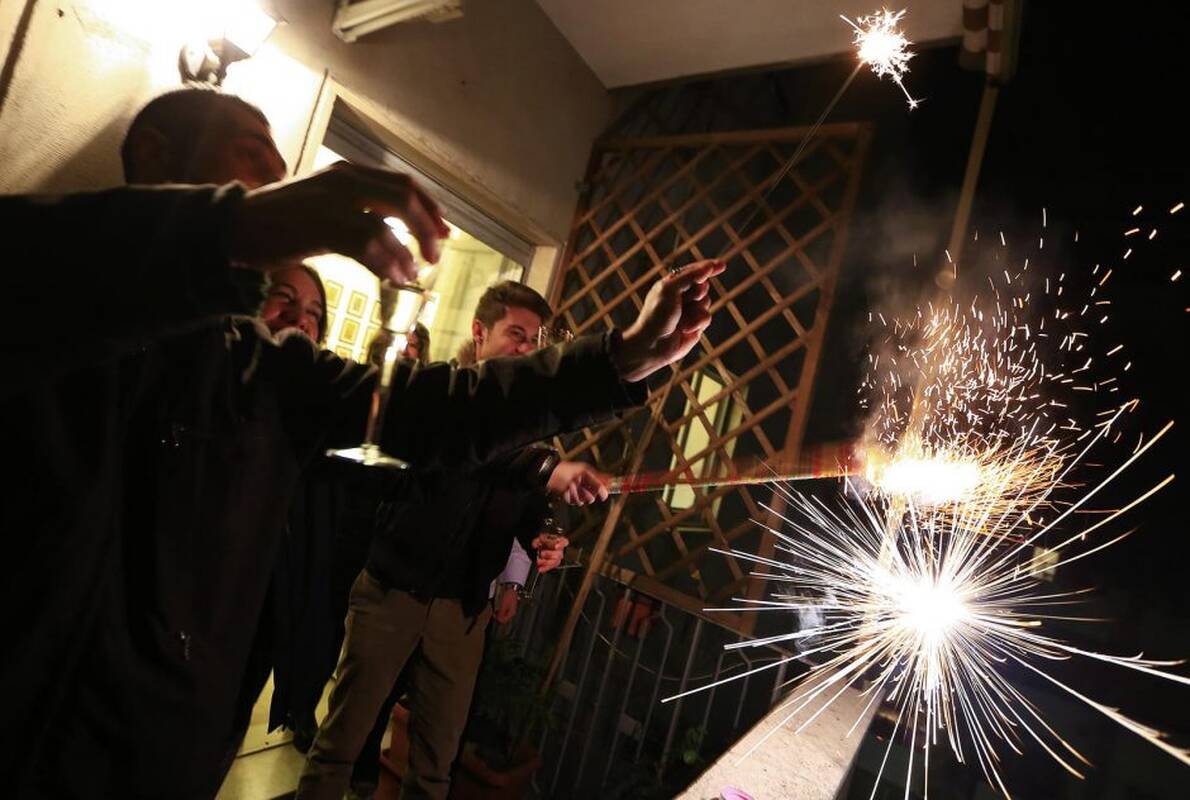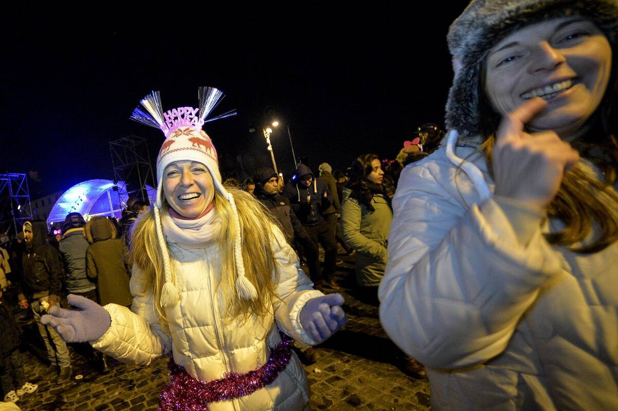 Žmonės buvo su tradiciniais švenčių cilindrais, bučiavosi ir darė asmenukes, kai didžiulis, apšviestas stiklinis rutulys slydo žemyn stiebu ir lygiai vidurnaktį pasiekė žemę.