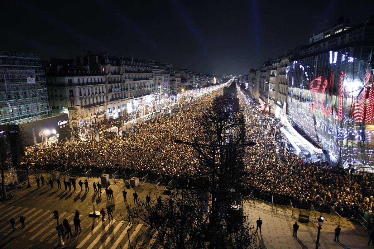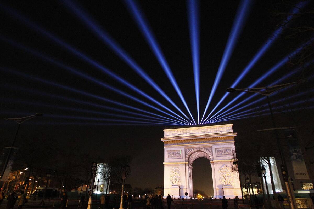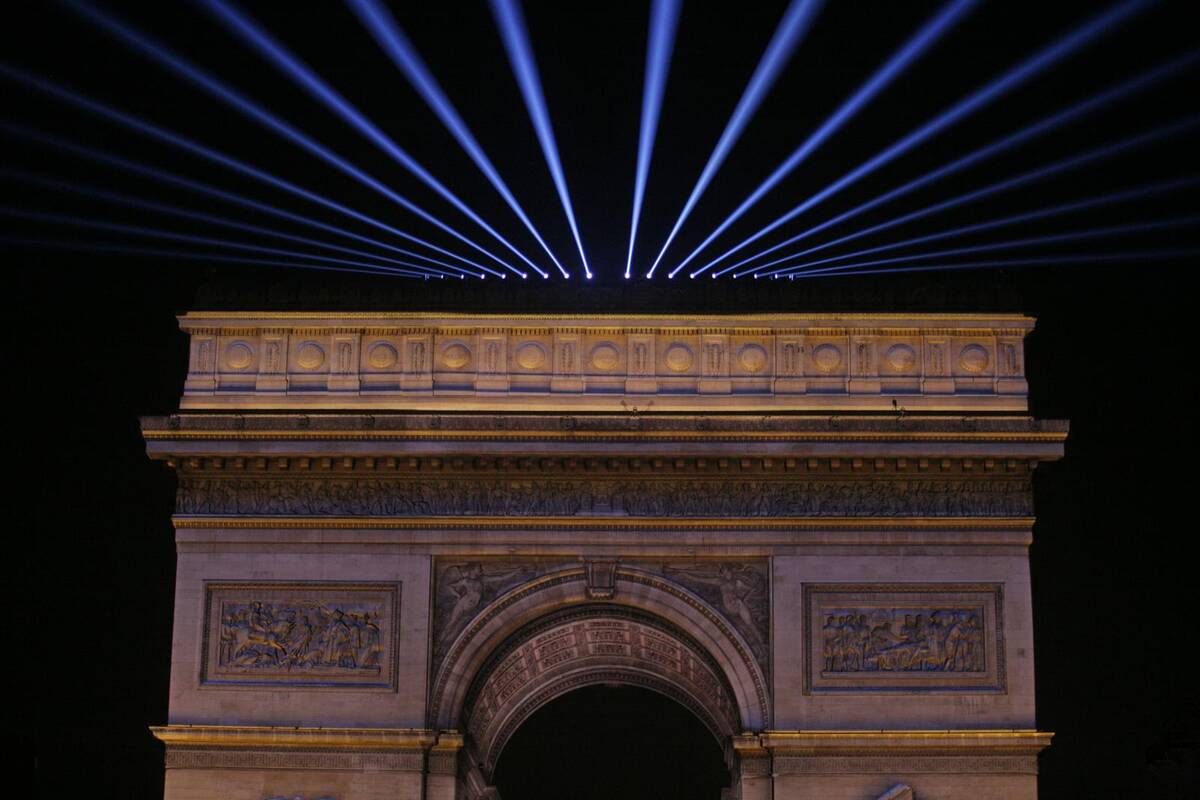 Paryžiaus Eliziejaus laukai buvo uždaryti eismui, kad pėstieji galėtų stebėti vaizdo projekciją ant Triumfo arkos ir didžiulį fejerverkų šou vidurnaktį.