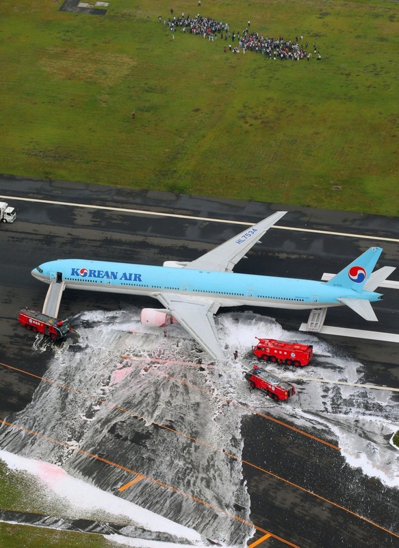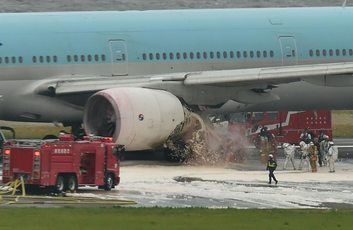 Japonijos televizija tiesiogiai transliavo tos operacijos vaizdą: mažiausiai du ugniagesių automobiliai užliejo putomis lėktuvo kairįjį variklį ir beveik visą jo bortą, o iš variklio galo veržėsi dūmai.
