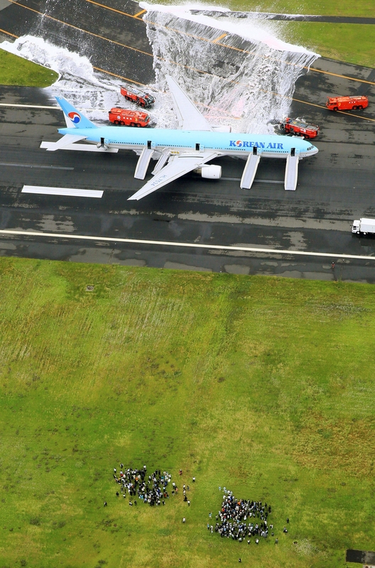 Didelis žmonių būrys buvo susirinkęs ant vejos oro uoste, esančiame Tokijo įlankos pakrantėje. Nuo lainerio durų buvo nuleistos avarinės evakuacijos čiuožynės.