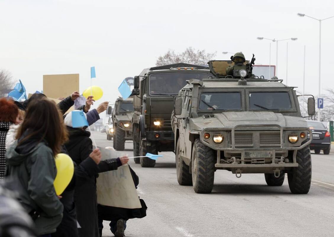 Kryme keli šimtai rusų karių maždaug 50 sunkvežimių šeštadienį važiuoja į bazę netoli Simferopolio, pranešė naujienų agentūros „Reuters“ reporteriai iš rusų okupuotos Ukrainos provincijos.