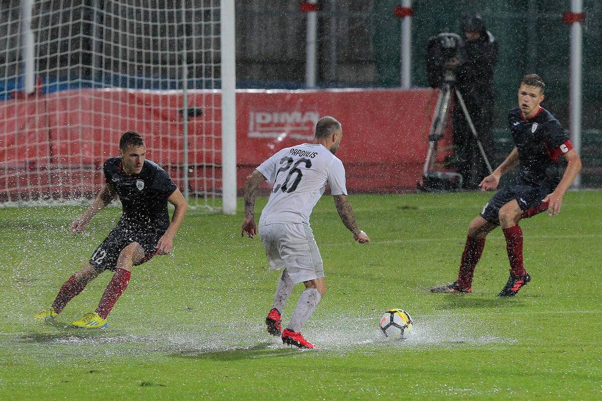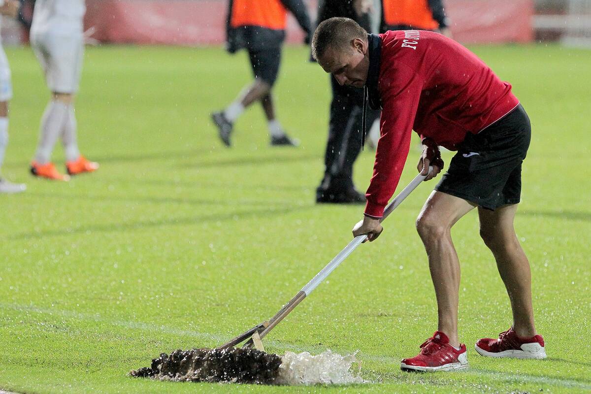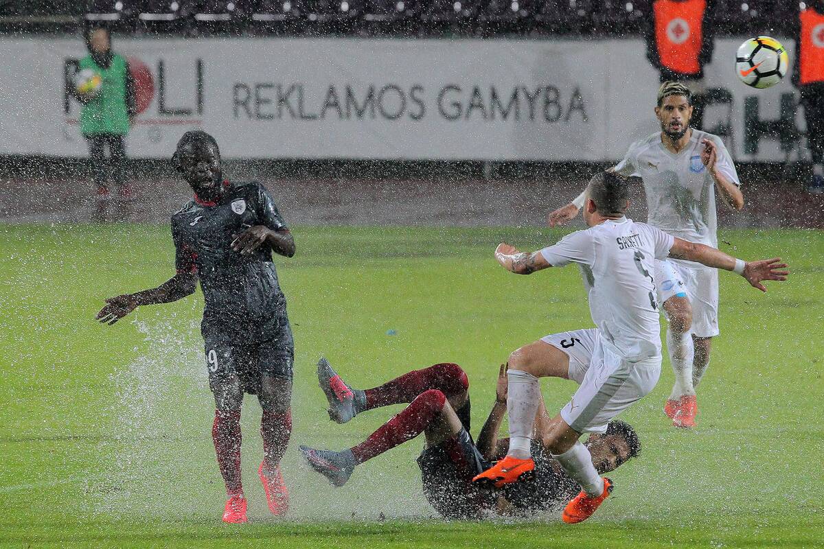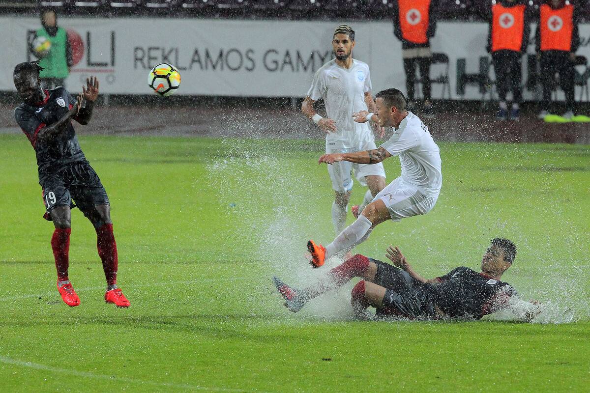 Rungtynės prasidėjo pliaupiant nepaprastai stipriam lietui. Aikštėje telkšojo didžiulės balos, tad futbolininkams žaisti buvo nepaprastai sunku.