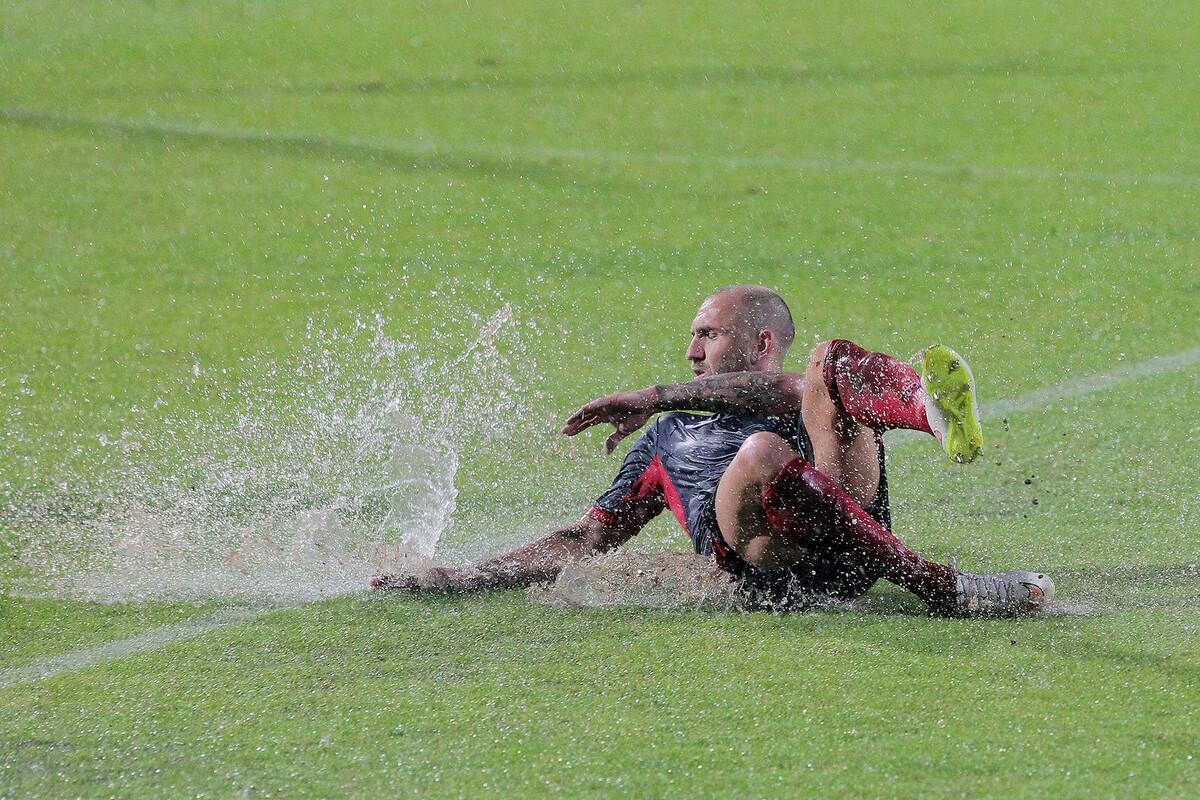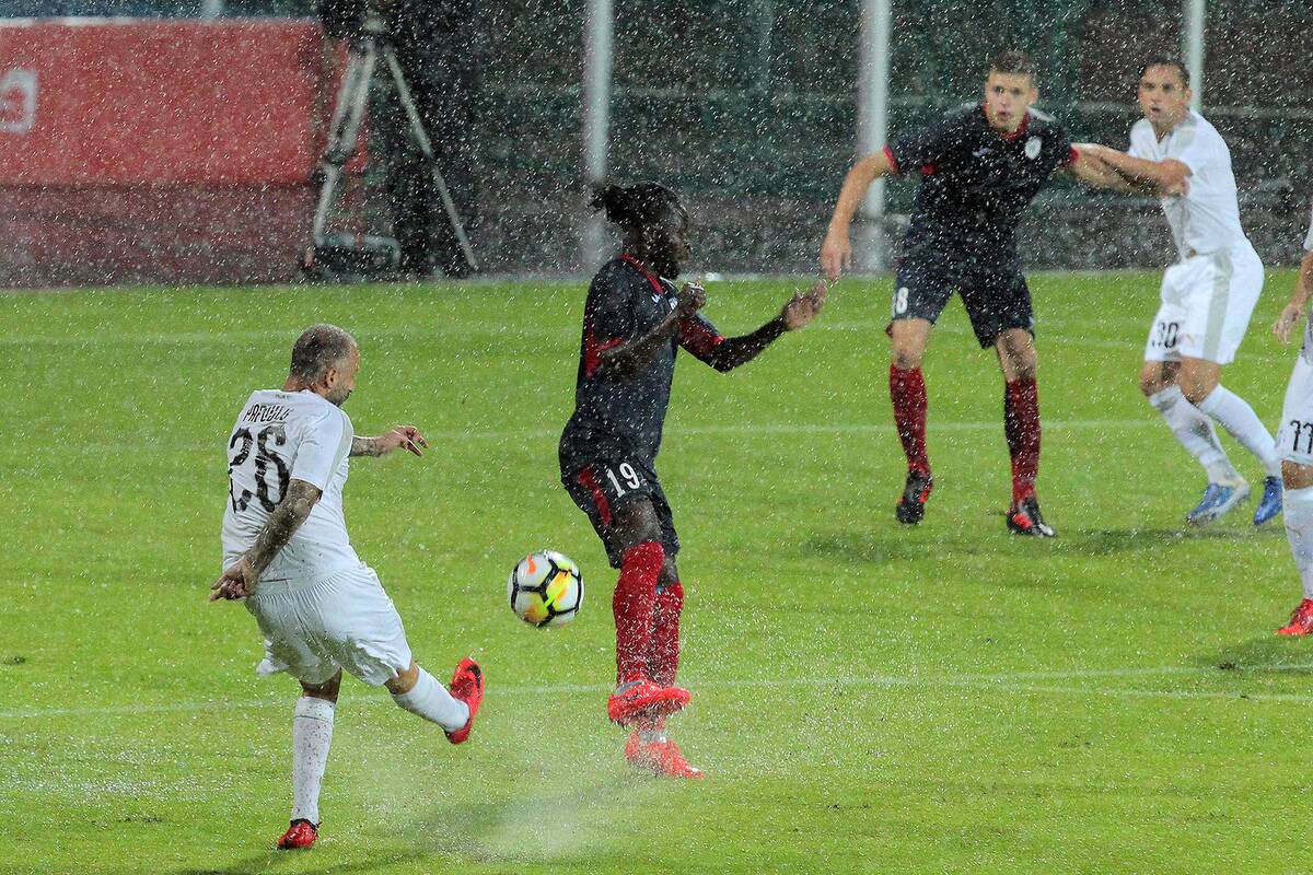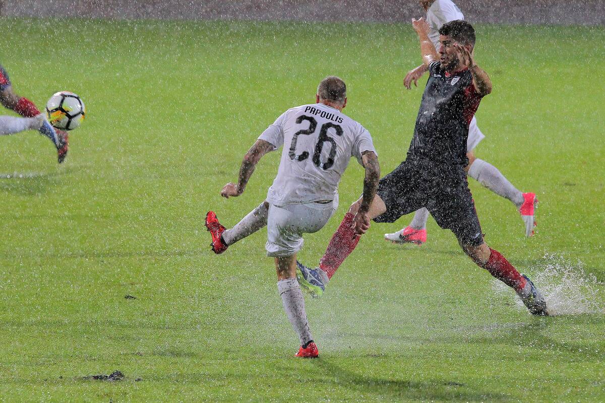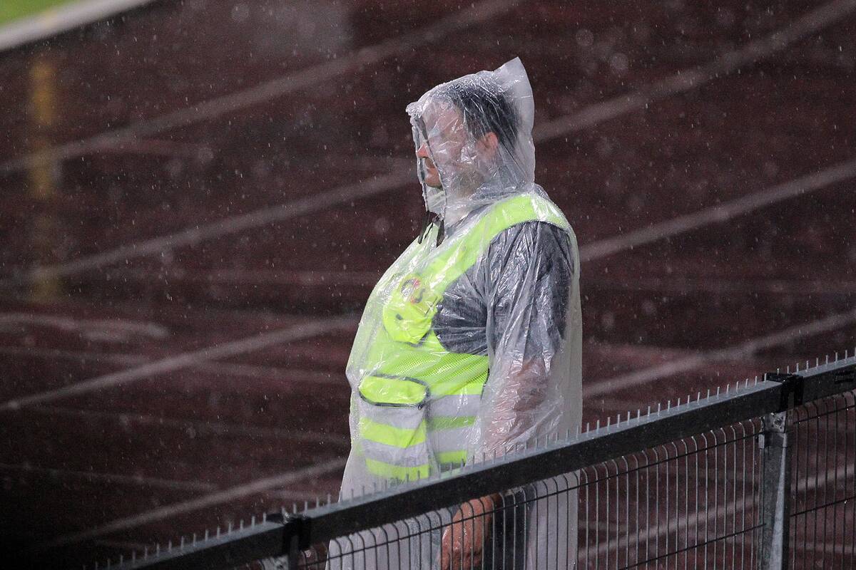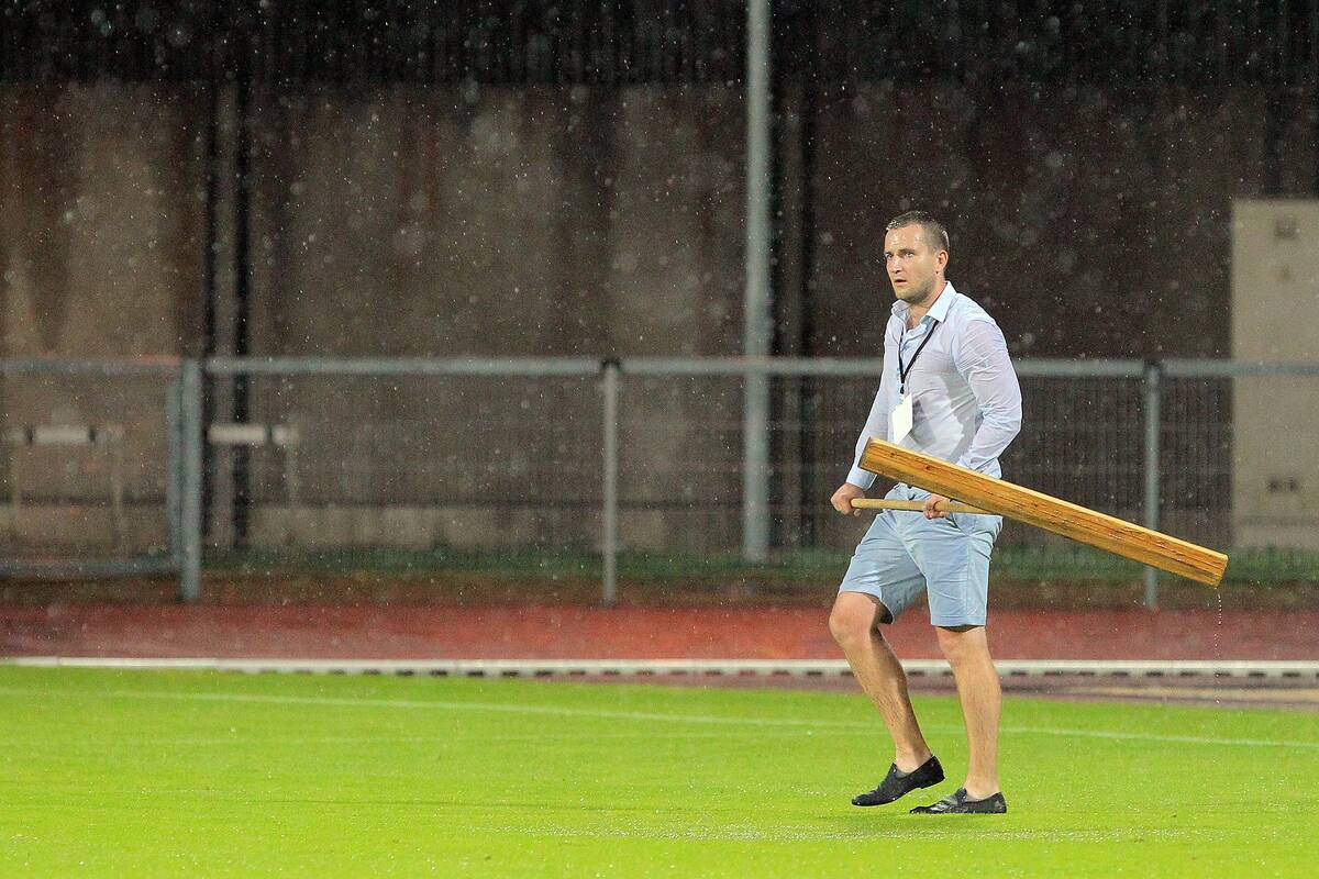 Rungtynės prasidėjo pliaupiant nepaprastai stipriam lietui. Aikštėje telkšojo didžiulės balos, tad futbolininkams žaisti buvo nepaprastai sunku.