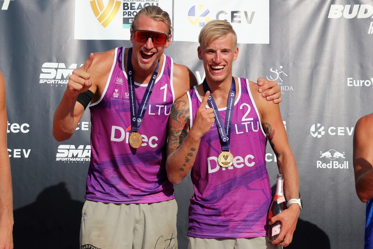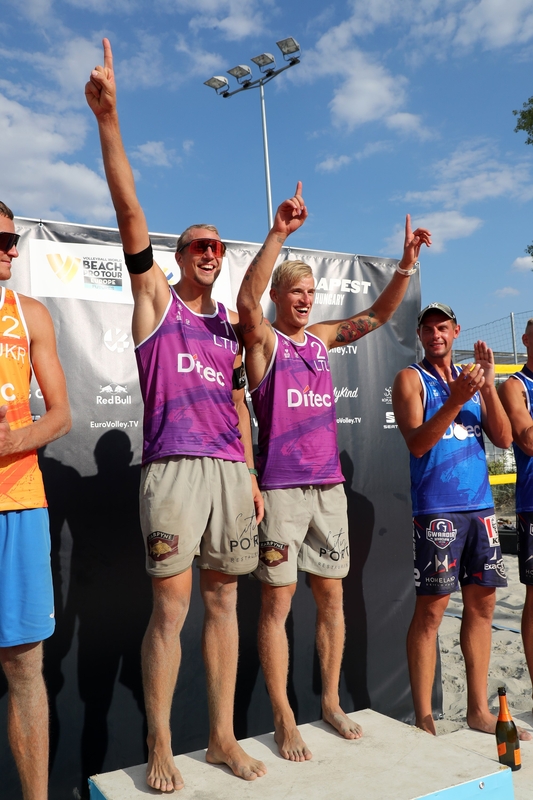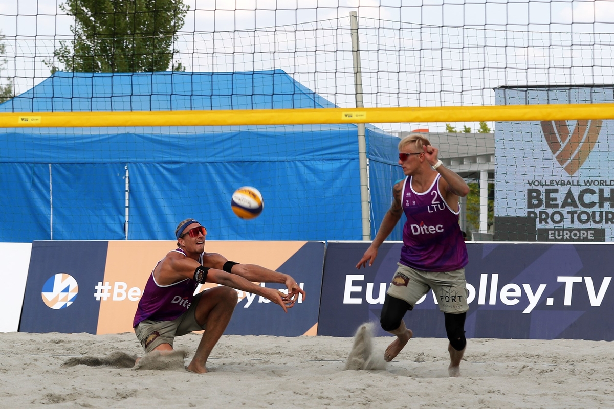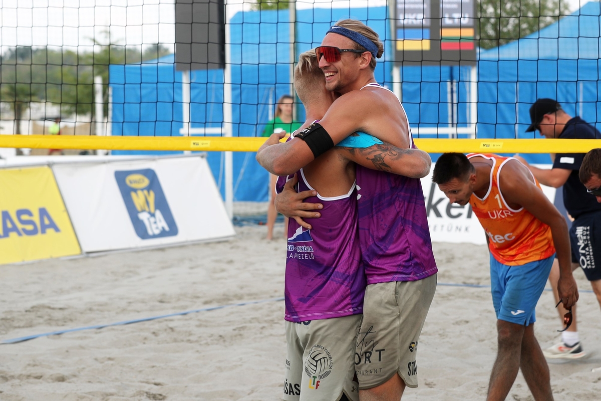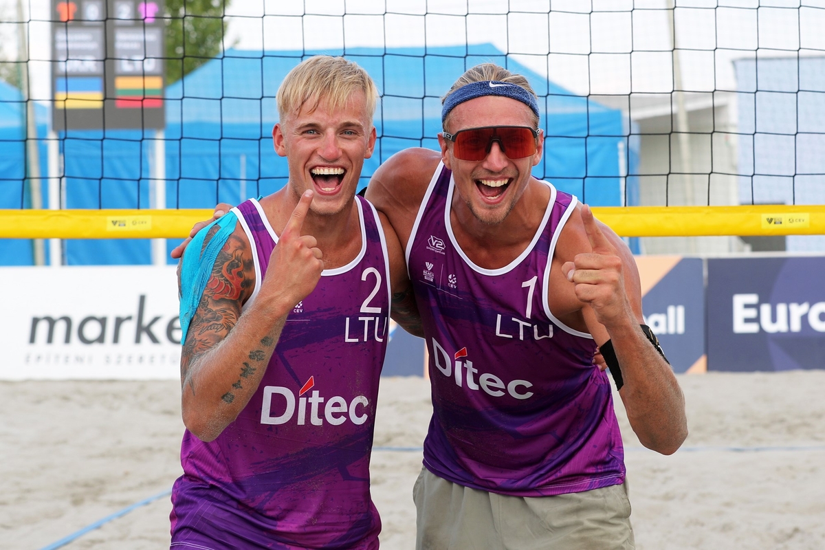 Turnyro Vengrijoje pusfinalyje lietuviai po ypač dramatiško pirmo seto 2-0 (27:25, 21:14) palaužė lenkus Piotrą Janiaką ir Jedrzejų Brozyniaką.
