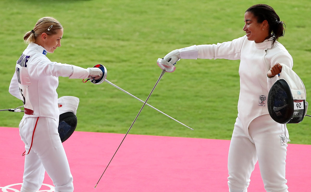 Prezidentas Gitanas Nausėda ir premjerė Ingrida Šimonytė sveikina šiuolaikinės penkiakovės atstovę.
