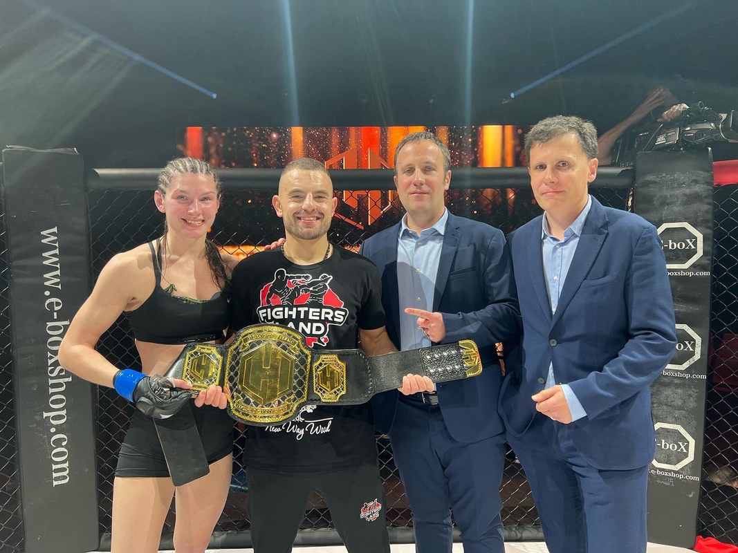 Sėkmė: E. Kareckaitę ir trenerį I. Barysą (antras iš kairės) pasveikino organizacijos „Hexagone MMA“ vadovai. / hexagonemma.fr ir AFP nuotr.