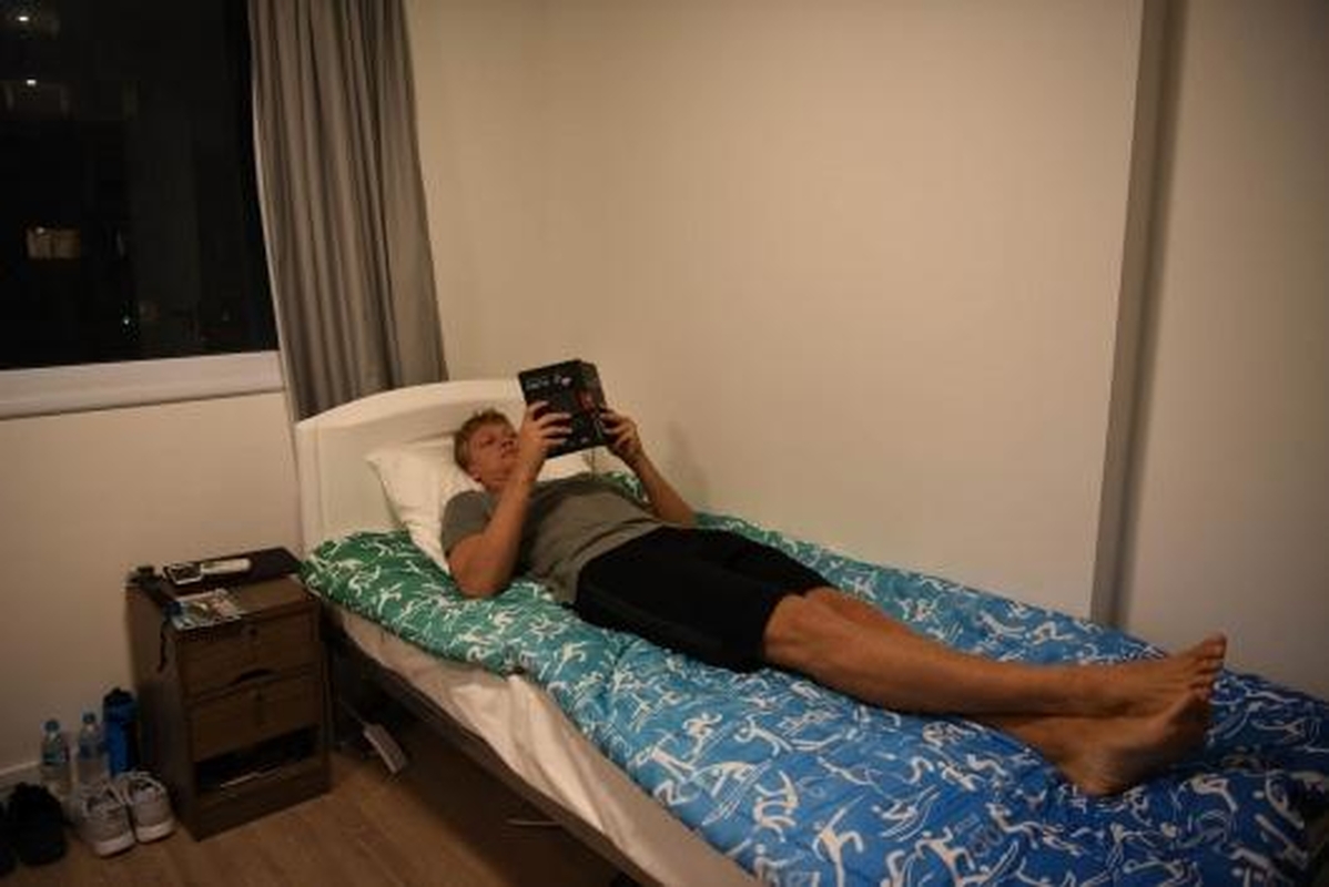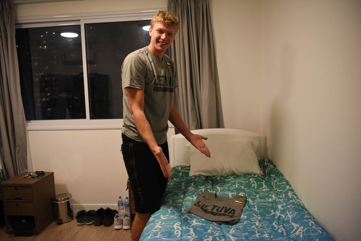 Ilgesnė lova nereikalinga ir jo komandos draugui Mindaugui Kuzminskui, eidamas miegoti jis taip pat išsiima lovos prailginimą.