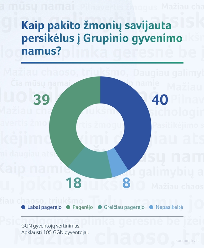 Savijautos pagerėjimą grupinio gyvenimo namų gyventojai visų pirma siejo su ramybe ir saugumu. Jų teigimu, grupinio gyvenimo namuose mažiau žmonių, triukšmo, chaoso, geresnė psichologinė atmosfera.