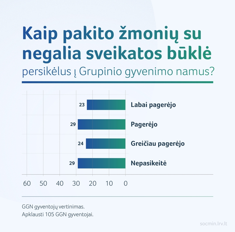 Vertindami sveikatos pokyčius grupinio gyvenimo namų gyventojai minėjo, kad persikėlus sveikata labai pagerėjo, pagerėjo arba greičiau pagerėjo – iš 105 asmenų taip manė 76, likusieji sakė, kad niekas nepasikeitė. Pagerėjimą jie sieja su geresne emocine būsena. Kaip sako vienas gyventojas: „Tarp ligonių – ligonis, tarp sveikų – sveikas“. Ši citata atspindi dažnai specialistų įvardijamą faktą, kad aplinka lemia žmogaus būseną ir emocijas.