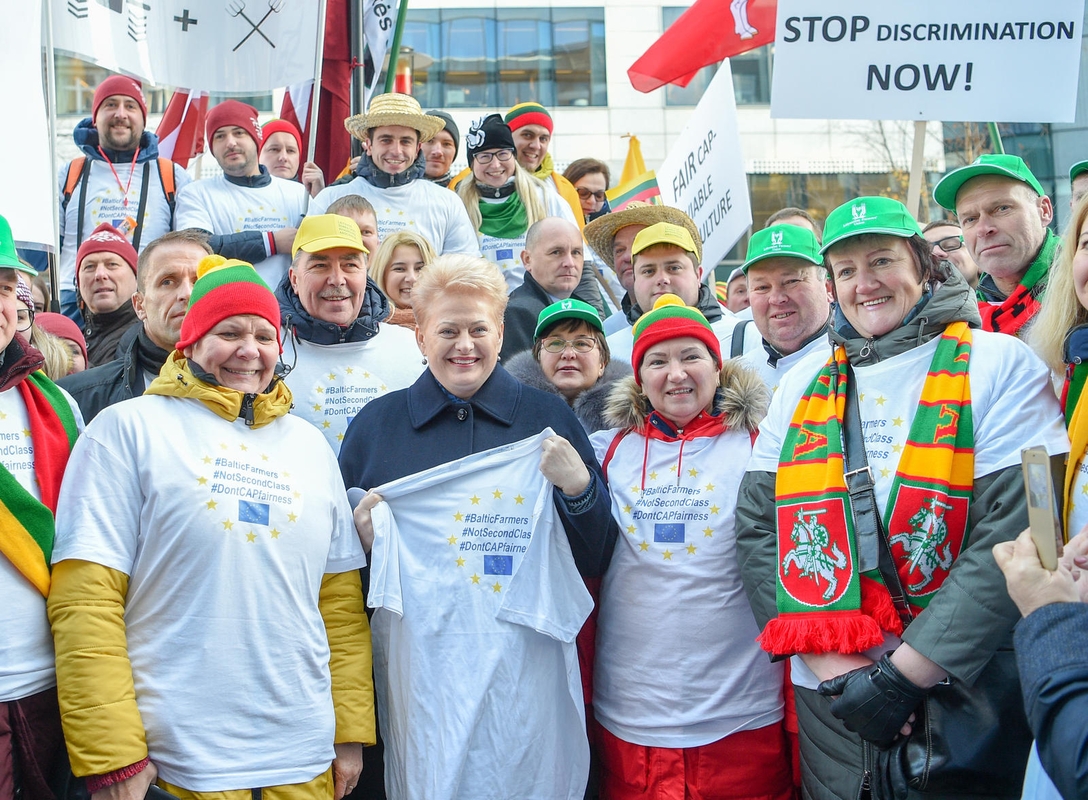 Pirmoji iš Baltijos šalių prezidentų su protesto akcijos dalyviais pasikalbėti atvyko prezidentė Dalia Grybauskaitė. Ji mitingo dalyvius tikino, kad stengiasi ir toliau stengsis dėl žemės naudmenų išmokų Lietuvoje suvienodinimo ir jo priartinimo prie ES vidurkio.