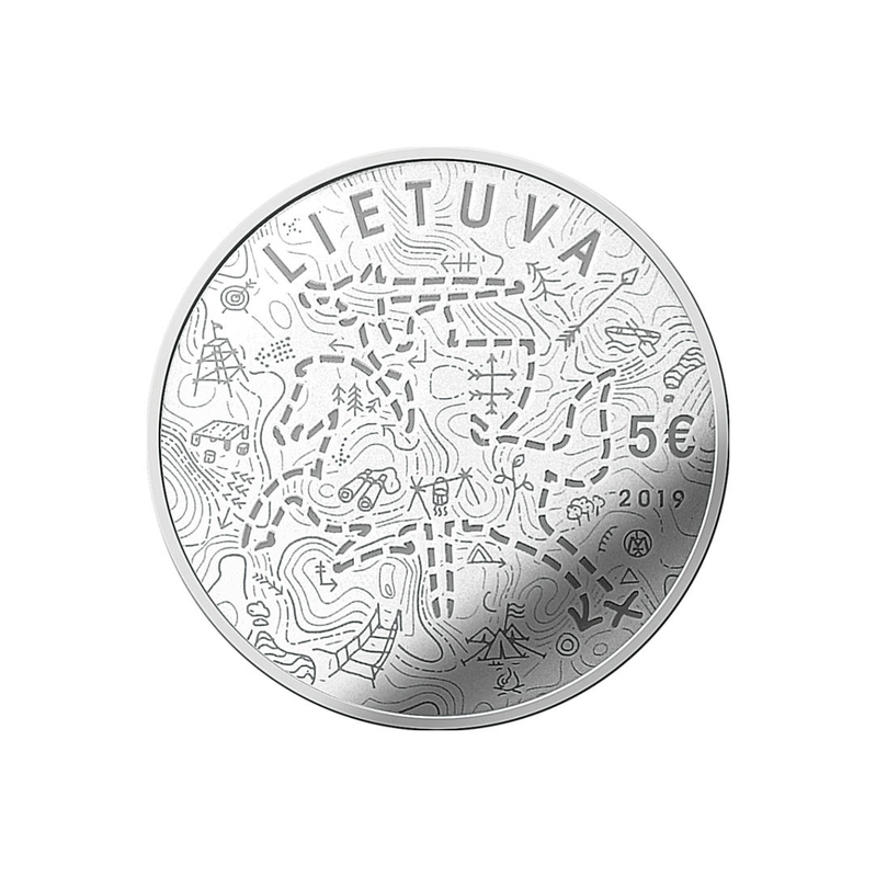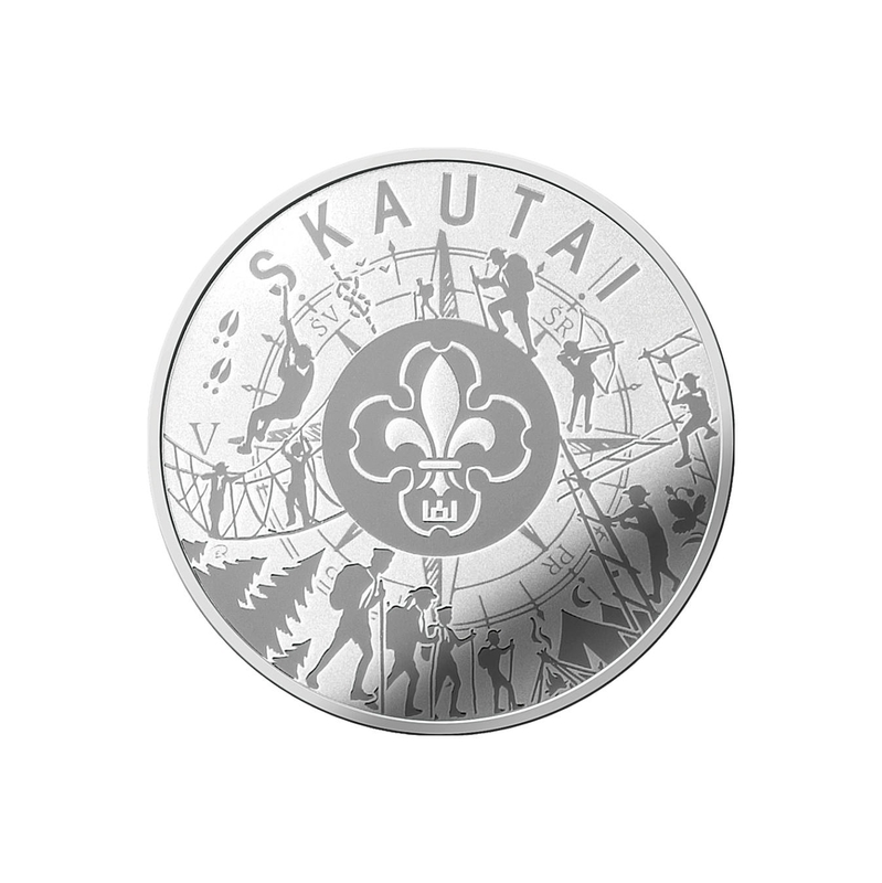 Monetos averse – Vyčio siluetas, suformuotas iš punktyru pažymėto kelio, fone – simbolinis skautų žemėlapis su nuorodomis. Kitoje monetos pusėje pavaizduoti skautų veiklos elementai (gyvenimas po atviru dangumi, stovyklos, žygiai), o centre – Lietuvos skautijos ženklas lelijėlė.