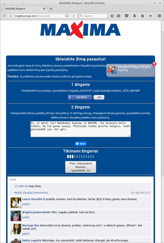 „Maxima“ informuoja, kad visi prekybos tinklo organizuojami žaidimai ir akcijos yra skelbiami oficialioje tinklo interneto svetainėje, skiltyje „Teminės akcijos“. Čia skelbiami ir visi žaidimų nugalėtojai, kurie visuomet informuojami asmeniškai, nurodant, kokiu būdu laimėtojai gali atsiimti prizus, pavyzdžiui, kreiptis į prizų koordinatorių. Šiandien plintanti informacija nėra „Maximos“ organizuotas žaidimas, o tiesiog prekybos tinklo vardu neteisėtai pasinaudojęs virusas“, – sako Jaunius Špakauskas, „Maxima LT“ Korporacinių reikalų departamento direktorius.