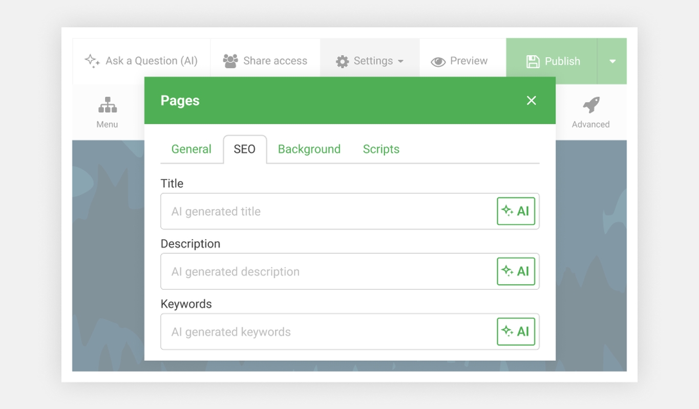 Optimizuoti svetainę SEO yra paprasta. Tai galite padaryti tiesiai kūrimo įrankyje, puslapio nustatymuose: įrašykite informaciją rankiniu būdu arba spauskite „Generuoti su AI“ ir AI užpildys laukus už jus.