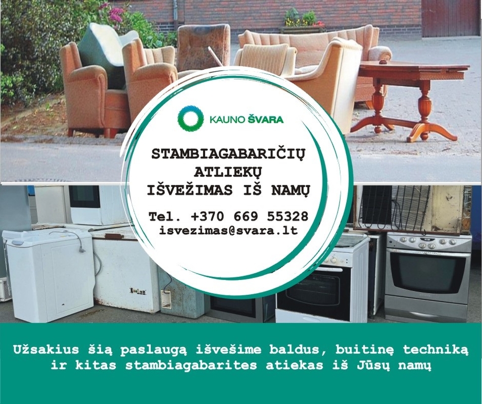 „Kauno švara“ gyventojams, neturintiems galimybės pristatyti nereikalingų daiktų į stambiagabaričių atliekų surinkimo aikšteles https://www.kaunoratc.lt/aiksteles/, gali padėti – teikia atliekų išvežimo iš namų paslaugą. Užsisakius atliekų išvežimo paslaugą, „Kauno švaros“ darbininkai iš jūsų namų išneš nereikalingas atliekas. Atliekos bus saugiai pristatytos į Kauno regiono atliekų tvarkymo centrą tolesniam tvarkymui. Stambiagabaričių atliekų išvežimo paslaugą galite užsisakyti labai paprastai, tereikia paskambinti tel. +370 699 55 328 arba rašyti e. p. [email protected]t, https://www.svara.lt/isvezimas/.
