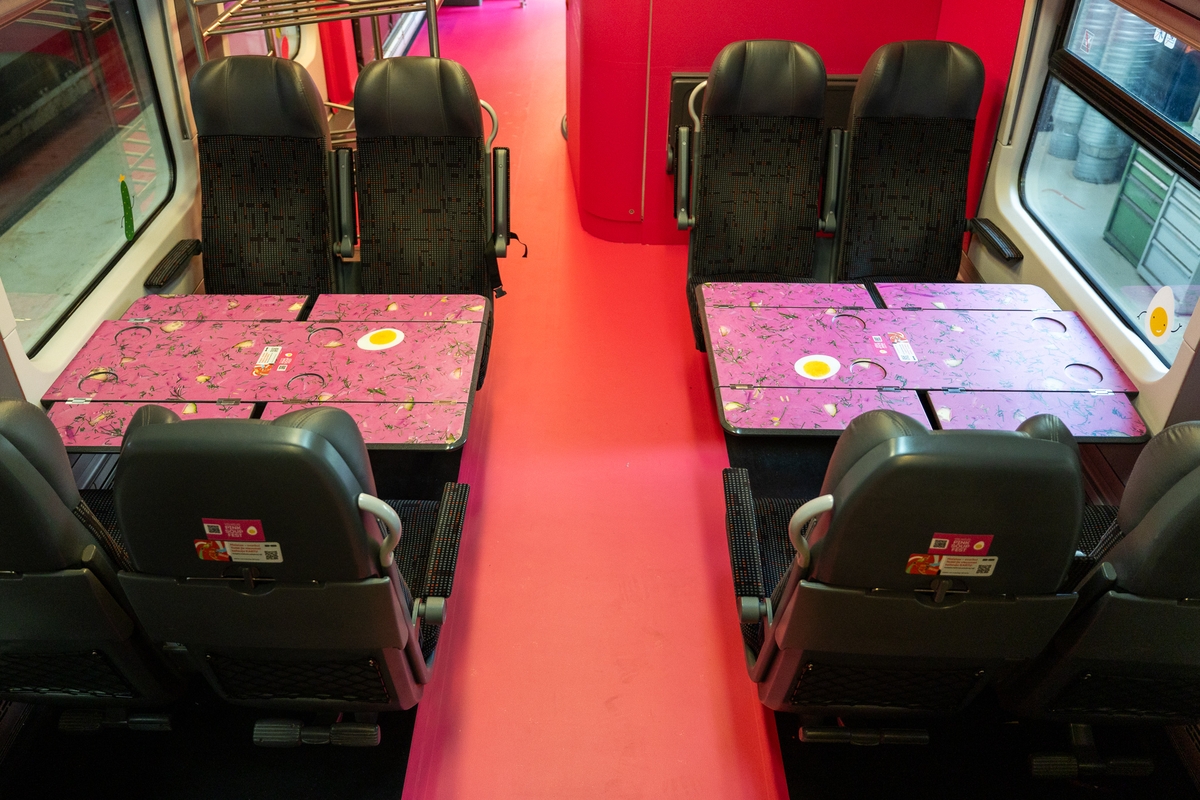 Išskirtinis traukinys dekoruotas bendradarbiaujant su „Go Vilnius“, taip simboliškai kviečiant keliautojus į gegužės 31 d. sostinėje vyksiantį vis daugiau gerbėjų sulaukiantį šaltibarščių festivalį „Vilnius Pink Soup Fest“.