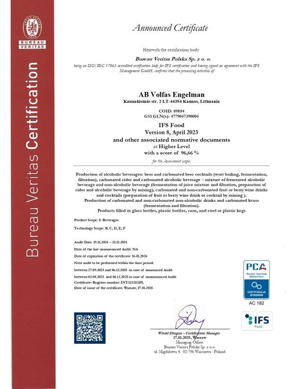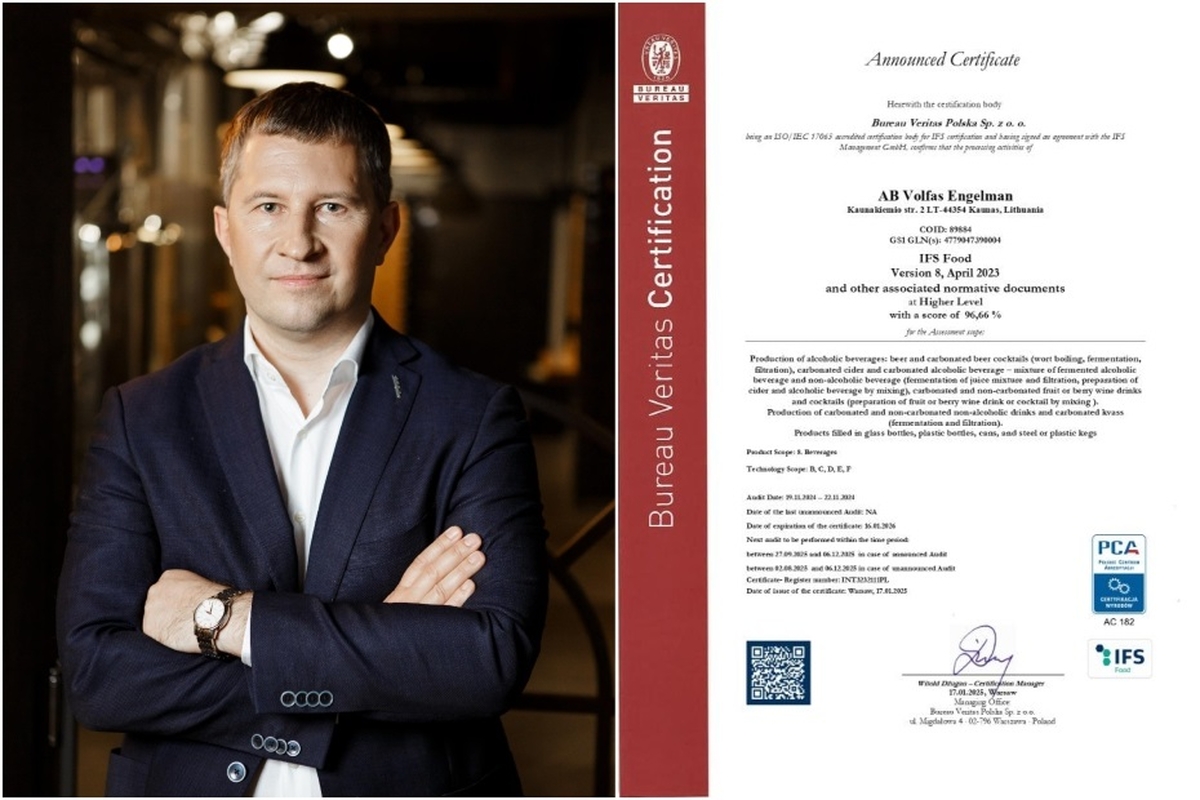 „Mūsų tikslas – ne tik užtikrinti aukščiausią gaminamų gėrimų kokybę, bet ir sudaryti sąlygas plėtrai tarptautinėse rinkose. IFS sertifikatas – tai ne tik garbės reikalas, bet ir verslo augimo garantas“, – sakė M. Horbačauskas.