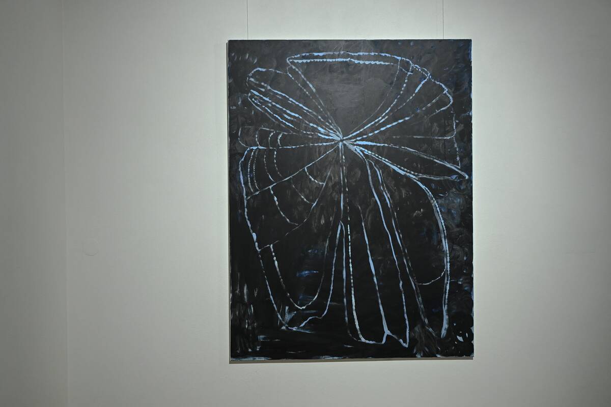 Žvelgdama į paveikslą „Išvedimas“ (2025 m.), sieju akį patraukusius dešinėje pusėje ištapytus zigzagus ir apskritimus. Čia vyraujanti švelniai mėlyna, baby blue, spalva ramina žvilgsnį, tarsi suteikia atokvėpio. Paveiksle įžvelgiu voratinklį – išsiplėtusį, kone erdvinį, nutįsusį, bet kartu struktūruotą ir santūrų. Pasirinkdama žydrą spalvą ir arachnofobus gana gąsdinantį motyvą, autorė sugeba sušvelninti įspūdį, nesukelti didesnės baimės.