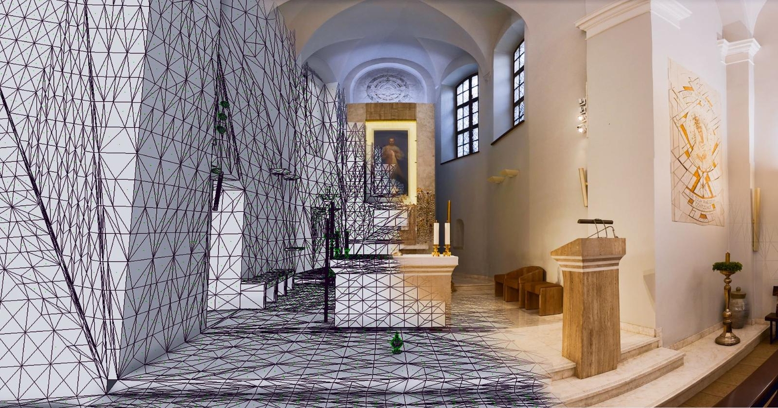 Siekiant perkelti Dievo Gailestingumo šventovę į virtualią realybę panaudoti lazerinio skenavimo, fotogrametrijos ir 3D modeliavimo metodai. Mišrių technologijų taikymas leido maksimaliai priartinti skaitmeninį modelį prie tikrovės. Dar sudėtingesnė užduotis buvo tinkamai 3D aplinkoje perteikti pagal vienuolės šv. Faustinos regėjimus nutapytą Dievo Gailestingumo paveikslą.