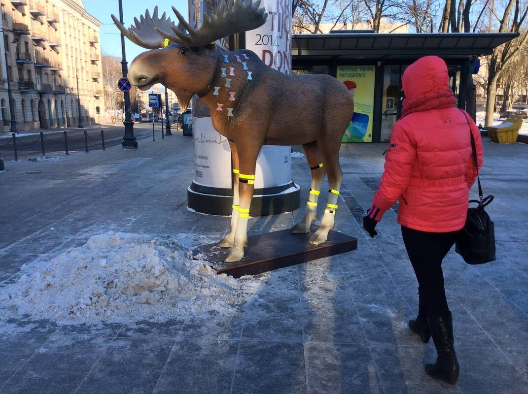 Sostinės Kudirkos aikštėje pėsčiųjų, dviratininkų ir automobilių vairuotojų dėmesį patraukia atšvaitais nusagstytas briedis.