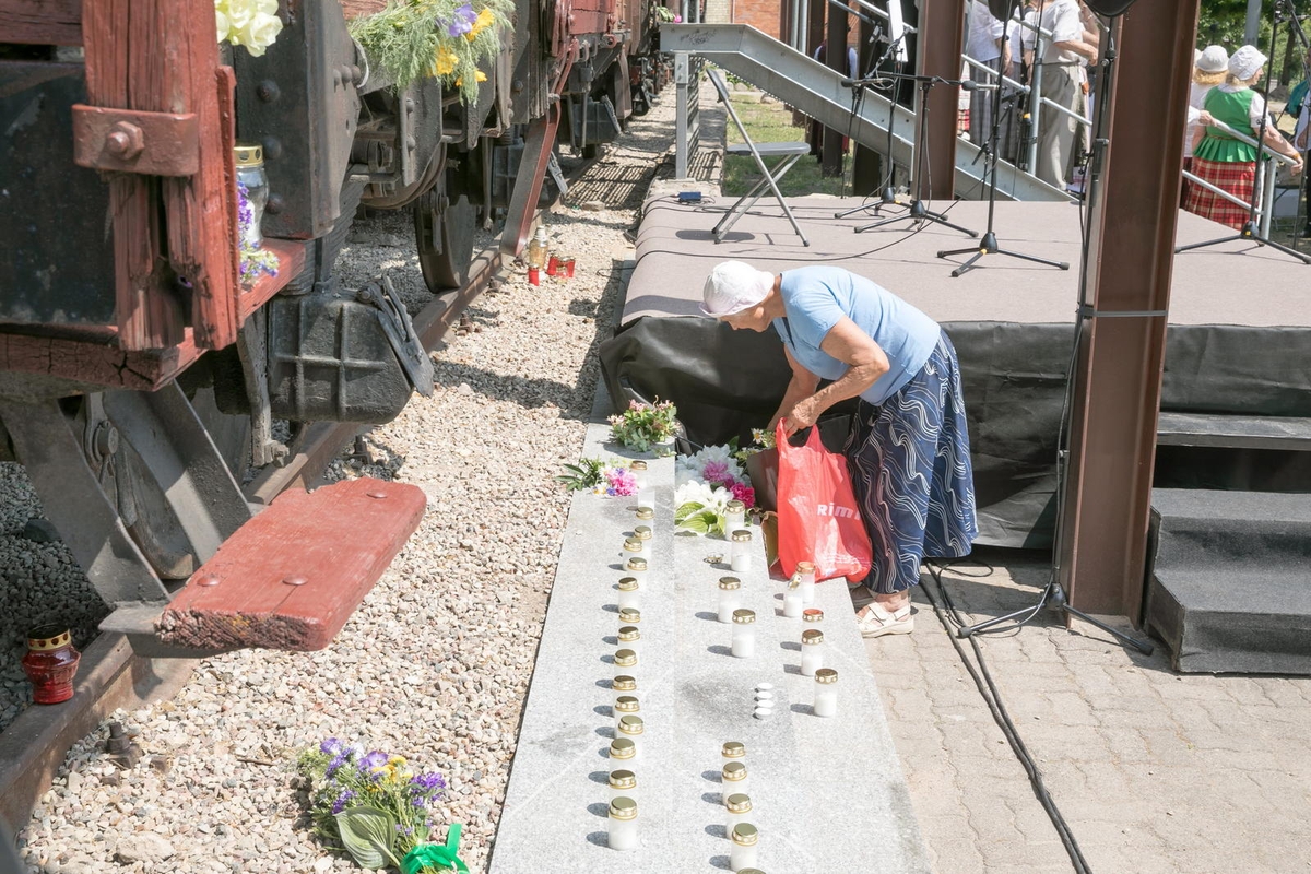 Visų vardu prie paminklinio Kryžiaus, iškalto iš geležinkelio bėgių, buvo padėta iš žalumynų supinta girlianda. Pasviręs Kryžius simbolizuoja tragišką tremtinių likimą. Naujosios Vilnios geležinkelio stoties aikštėje šis paminklas atidengtas minint 50-ąsias masinių tremčių Lietuvoje metines. Žuvusieji tremtyje proseneliai, seneliai ir tėvynainiai pagerbti tylos minute.
