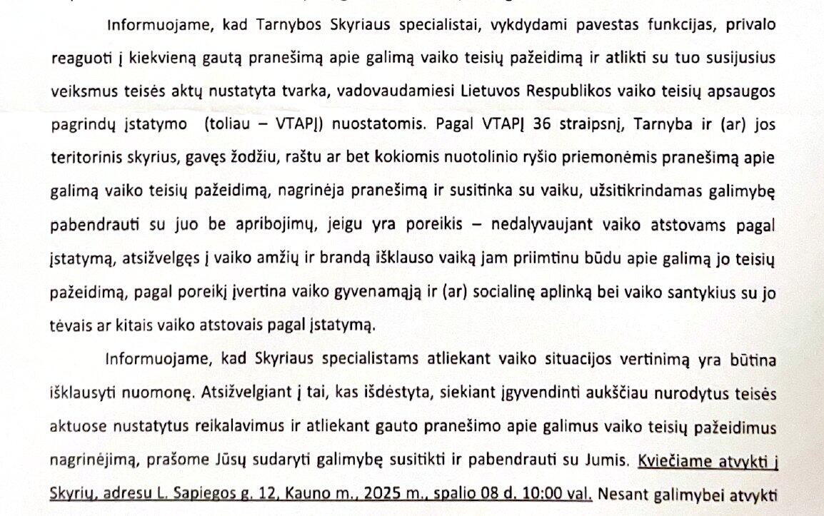 2025 m. spalio 9 d. su tarnyba susirašinėjęs pilietis gavo įstaigos išvadas, esą, jis atsisakė bendradarbiauti. „Delfi“ laišką su išvadomis matė, tačiau neviešina, kad nepažeistų vaiko interesų.
