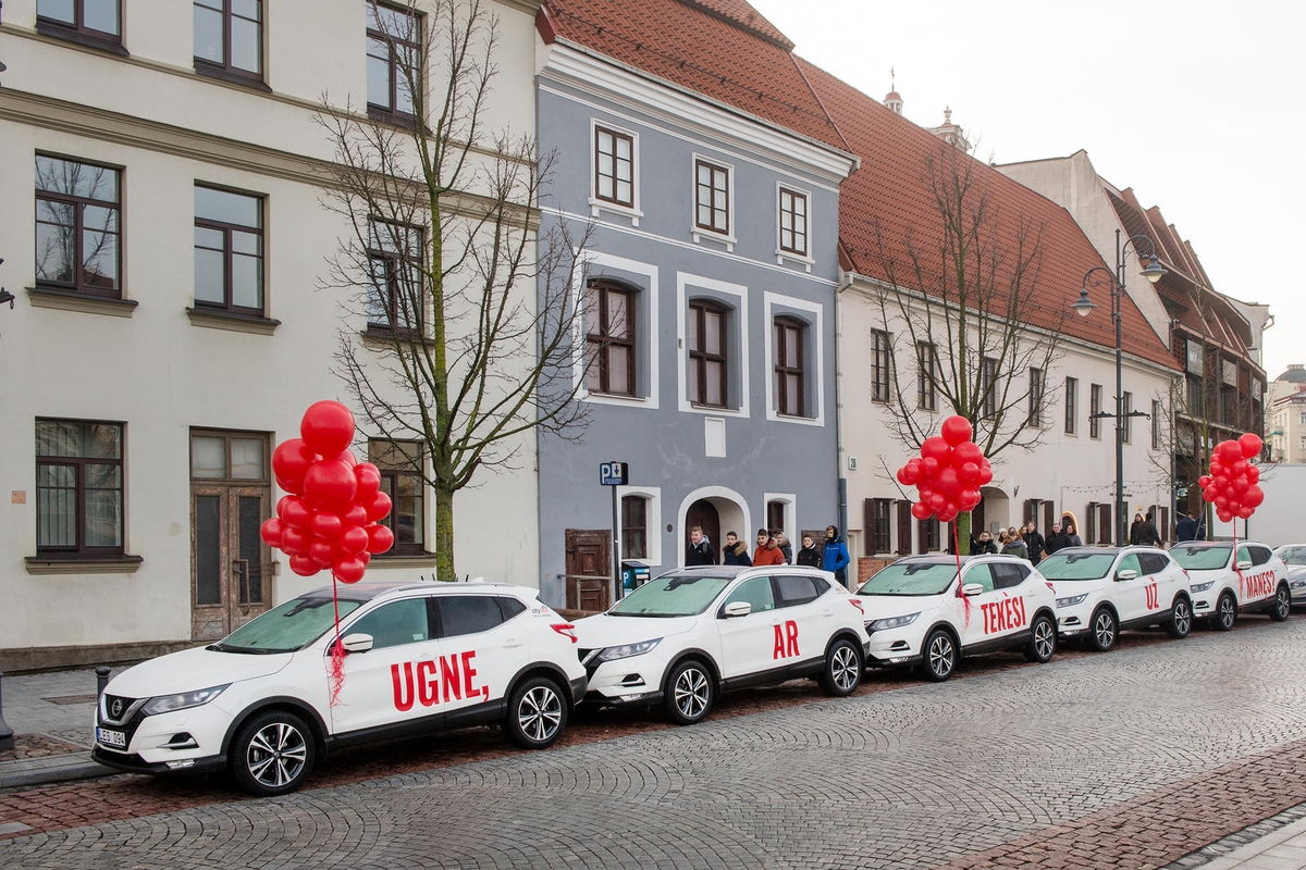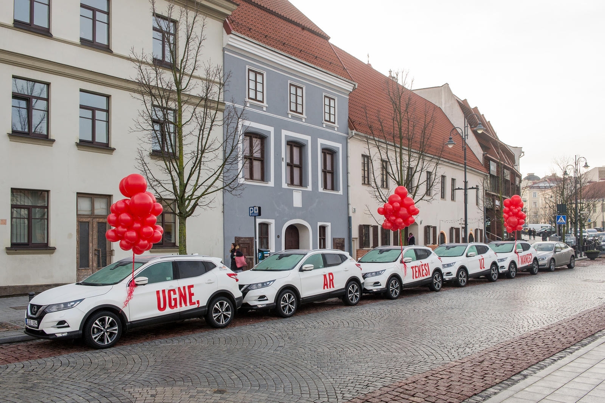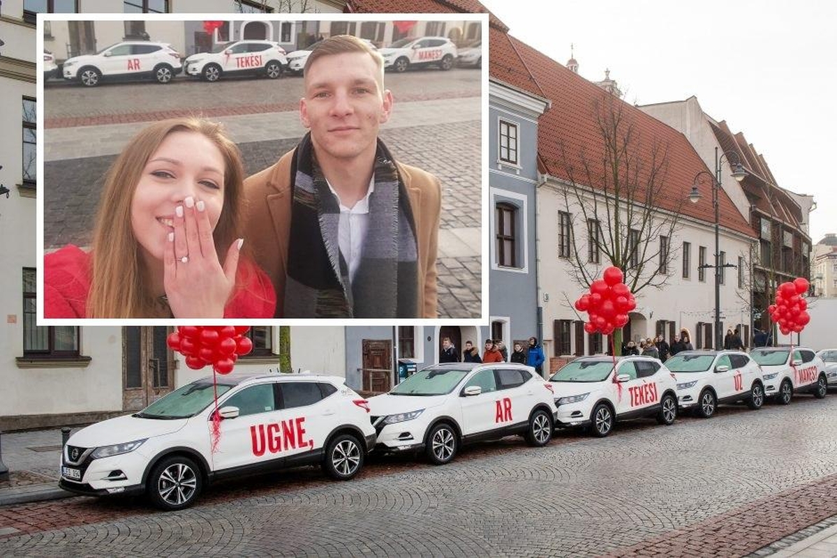 Paulius sugalvojo originalias piršlybas – ant penkių „Nissan Qashqai“ automobilių jis suklijavo lipdukus su žodžiais „Ugne, ar tekėsi už manęs?“.