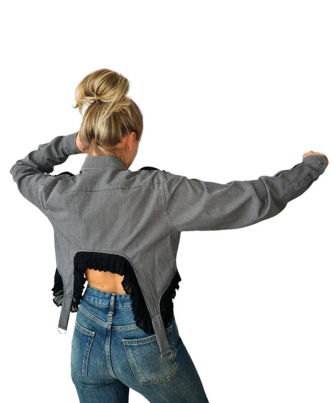 Gabrielė kuria vienetinius drabužius moterims, o medžiagų jiems ieško dėvėtų drabužių parduotuvėse. Oversize tipo moteriški marškiniai, kuriuos drąsiai galima vadinti jos vizitine kortele, siuvami iš kelių kokybiškų vyriškų marškinių, kuriuose svarbiausia – apykaklė ir rankogaliai.