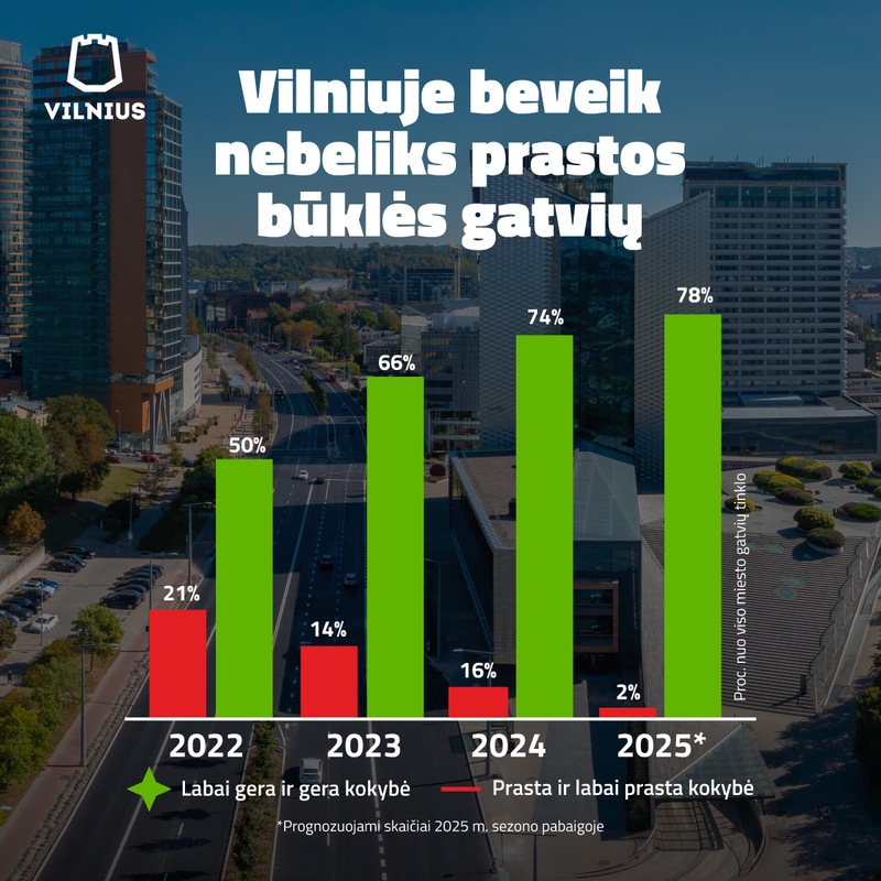 Vertinant kelių pastarųjų metų skenavimo metu gautus duomenis, nuo 2022-ųjų pabaigos, prastos ir labai prastos būklės gatvių sostinėje sumažėjo daugiau nei 2,5 karto. Skaičiuojama, kad po šio darbų sezono tokios būklės gatvių mieste liks tik apie 25 km arba ne daugiau nei 2,1 proc. viso gatvių tinklo.