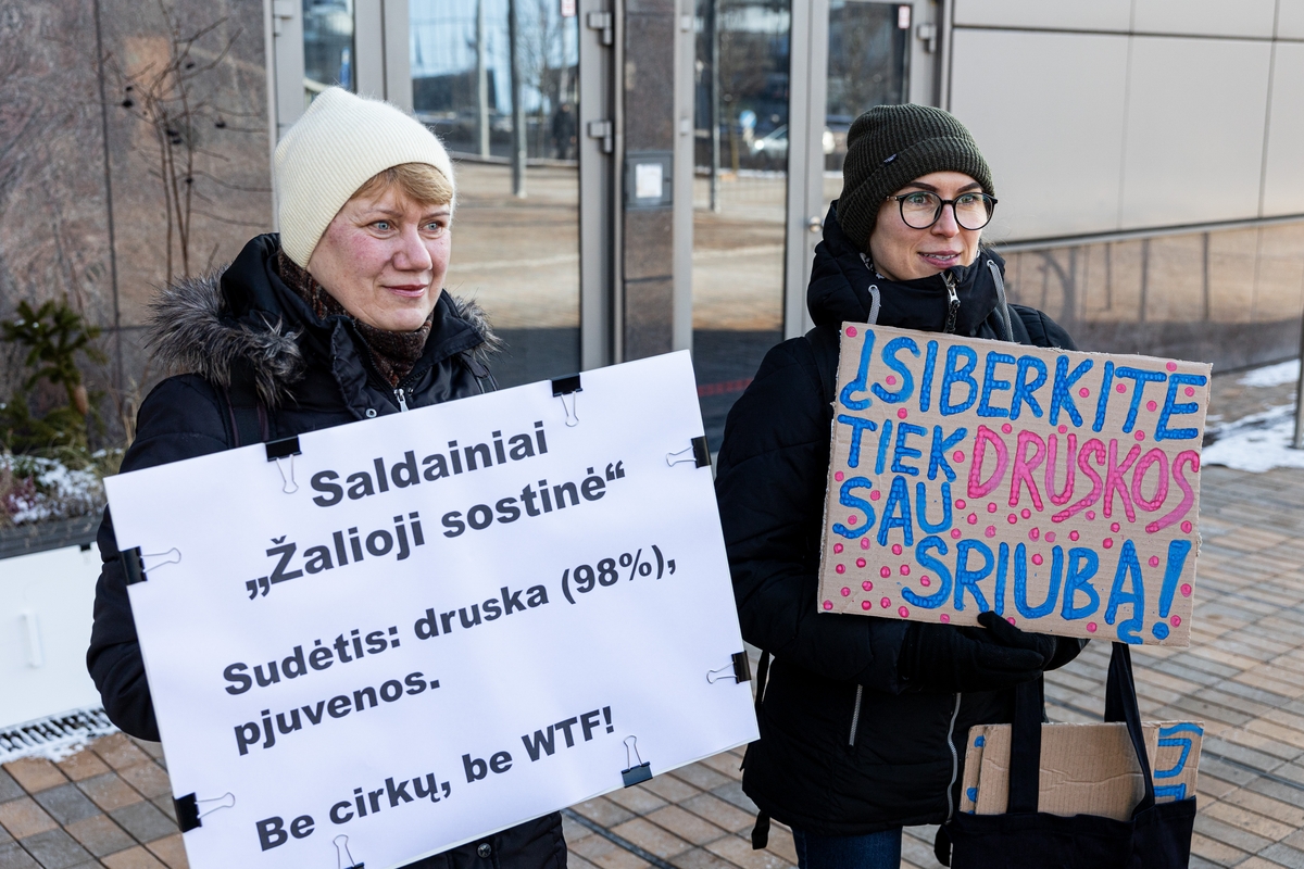 Prie savivaldybės vykusios protesto akcijos metu dalyviai laikė plakatus su užrašais „Druska žudo medžius“, „Mažiau druskos!“, „Įsiberkite tiek druskos sau į sriubą“.
