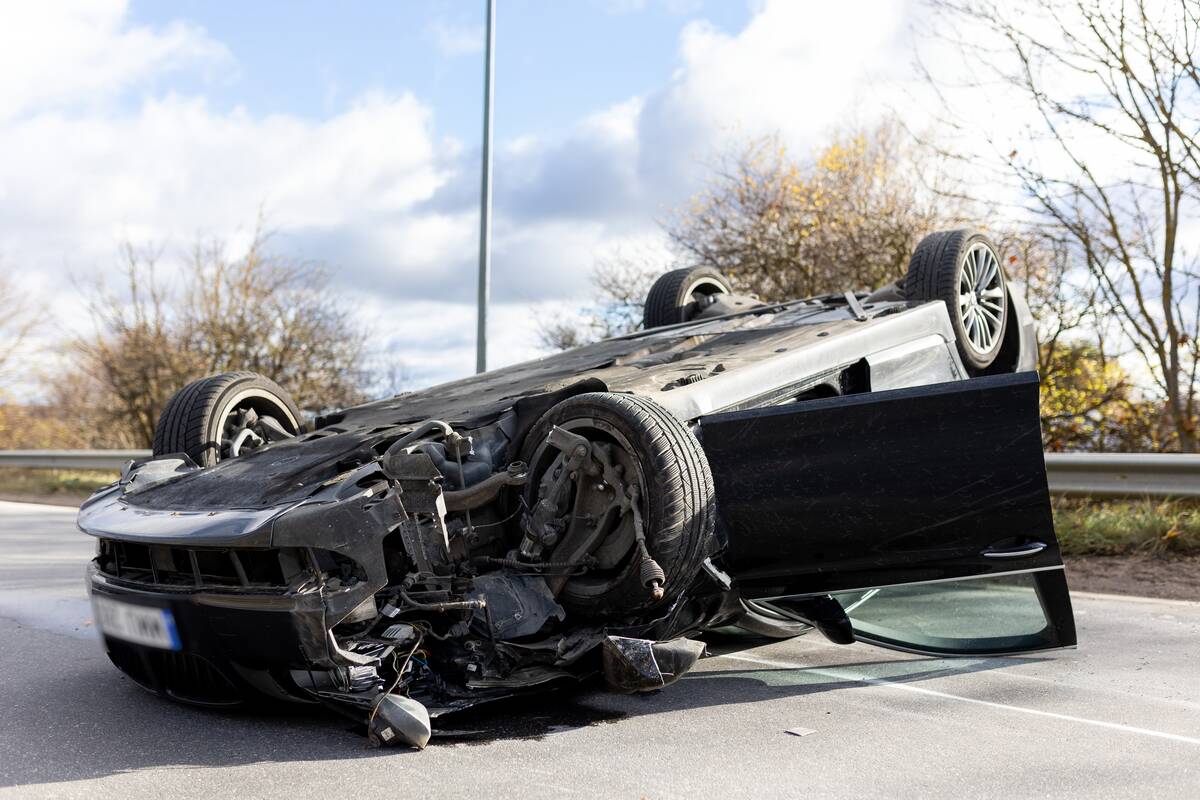 Kaip pranešė Vilniaus pareigūnai, iš apvirtusio automobilio iškrito 1979 metais gimęs vairuotojas ir nugertas viskio butelis.