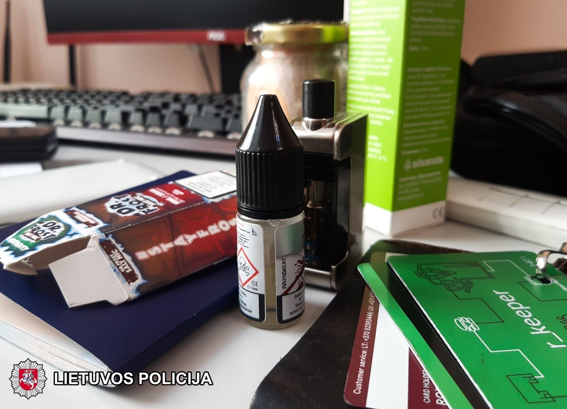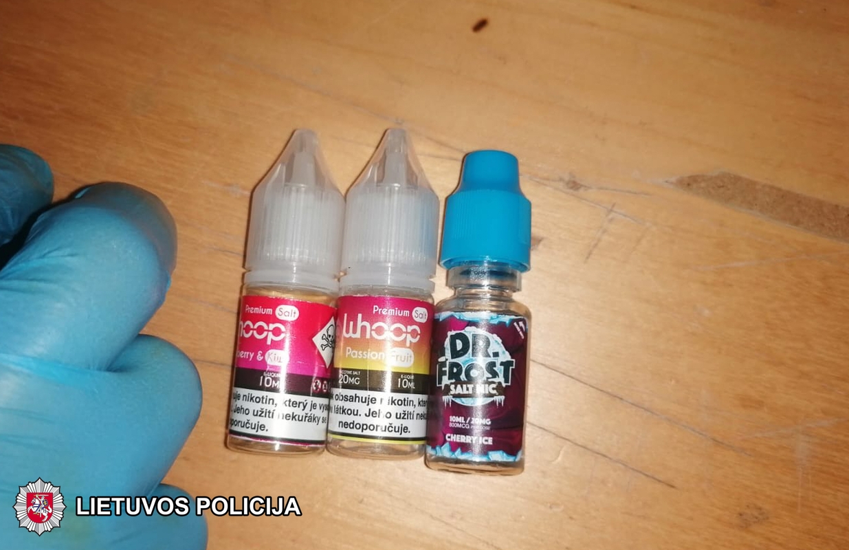 Balandžio viduryje policijos pareigūnai sulaikė du šešiolikmečius – merginą ir vaikiną, jie iš kito asmens įsigijo elektroninių cigarečių garinimo skysčio, jo sudėtyje galimai yra psichotropinių medžiagų.