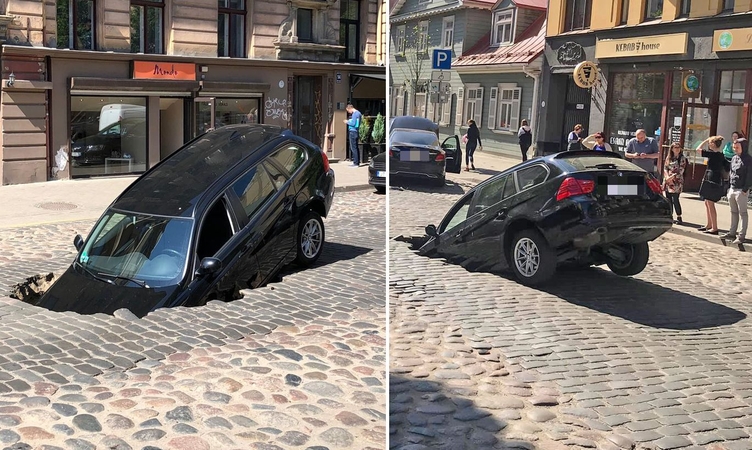 Rygoje į gatvėję atsivėrusią smegduobę įkrito du automobiliai